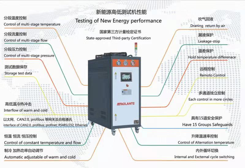 深圳奧蘭特機械新能源高低溫測試功能齊全,并且計量精度都是經過國家第三方計量檢測機構檢驗,并取得檢定證書。在設備的流量控制、壓力控制、溫度控制精度都媲美進口設備。奧蘭特高低溫測試機功能多樣化,,具體有分段流量控制、分段溫度控制、分段壓力控制、制冷加熱功率自動調節、自動補液、吹氣回液、漏油報警、升降溫速率控制、單系統多通道獨立控制,擁有強大的通訊功能:485通訊、以太網、MODBUS、PRPFIBUS、CAN2.0,讓設備可以便捷的和主輔設備進行通訊遠程控制。深圳奧蘭特機械于國內外眾多的新能源汽車廠家、檢測機構、汽車研究所都已經進行深度合作。